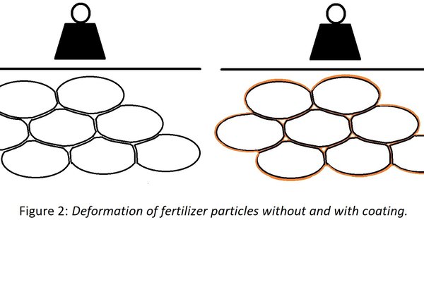 Nearly every fertilizer which is stored and handled in bulk is prone to caking. Everybody active in the fertilizer business has seen examples of massive lumps. One of the causes of caking is that salt bridges between the fertilizer particles are being formed due to humidity cycles or migration of moisture present internally in the fertilizer. This can be solved by using coatings, talcum powder or other additive that form a protective layer around the particles and thus reduce the interaction between particles (Figure 1). A good anticaking treatment should minimally give 90+% caking reduction compared to untreated fertilizer.